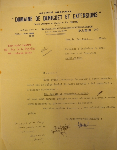 Papier en tête de la société agricole propriétaire du domaine de l'Île Beniguet en 1932 (AD 22)Immatriculation