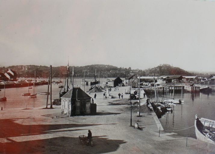 Vue de la bascule au 1er plan et de la capitainerie à l'extrémité du Quai Neuf, avec les annexes des Ponts-et-Chaussées, vers 1950 (carte postale, collection particulière)Immatriculation