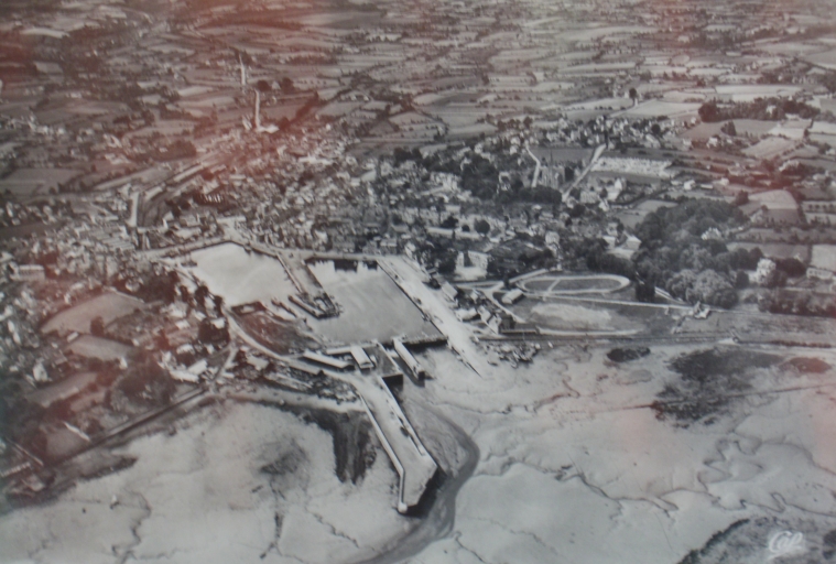 Vue aérienne du port de Paimpol et des bassins vers 1950 à marée basse (carte postale, collection particulière)Immatriculation