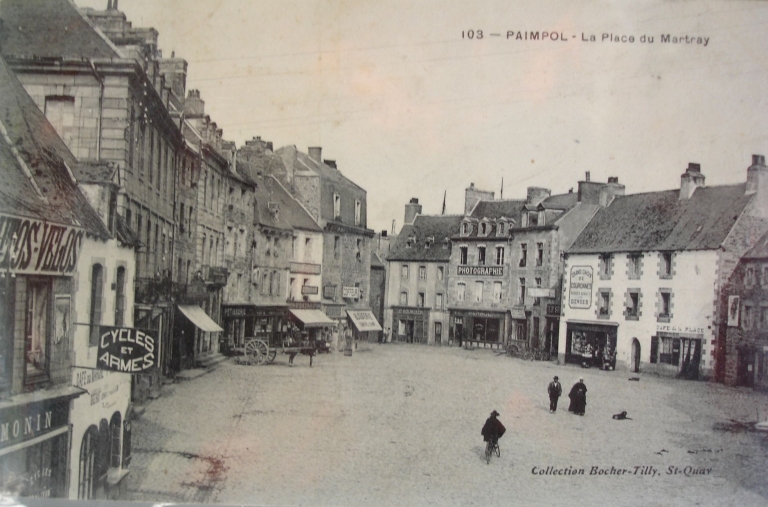 La place pavée du Martray avec ses différents commerces, 1er quart 20ème siècle : le marchand de cycles Séguillon, le courrier de Bréhat, le commerce de peinture Bourcier (carte postale, collection particulière)Immatriculation