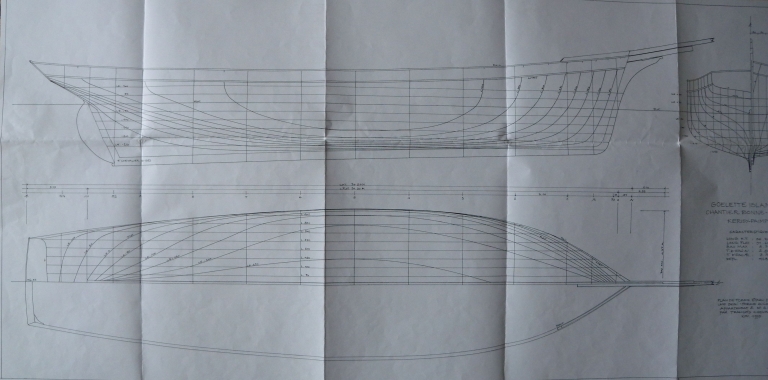 Reproduction d'un plan de forme d'une goélette d'Islande construite par le chantier Bonne-Lesueur, 1er quart 20ème siècle (collection particulière, François Chevalier, 1995)Immatriculation