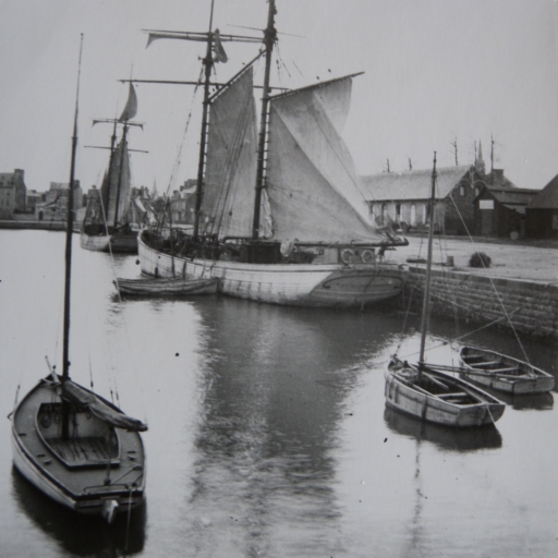 Vue d'une goélette devant le grenier à sel, Quai Loti, 1er quart 20ème siècle (carte postale, collection particulière)Immatriculation