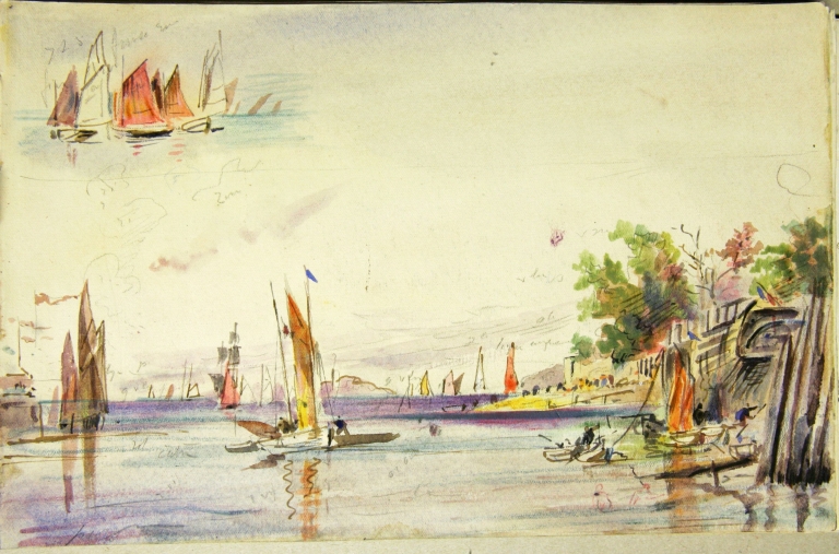 Dessin aquarellé de Louis-Marie Faudacq : départ des régates dans l'avant-port de Paimpol, vers 1880-90 (extrait des carnets de Faudacq, collection particulière)Immatriculation
