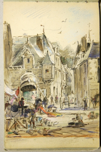 Dessin aquarellé de L.M. Faudacq : la place du Martray et la rue de Ploubazlanec, 4ème quart 19ème siècle (extrait des carnets de Faudacq, collection particulière)Immatriculation