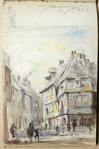 Dessin aquarellé de L.M. Faudacq : la place du Martray et la rue de la Vieille Poissonnerie, 4ème quart 19ème siècle (extrait des carnets de Faudacq, collection particulière)Immatriculation