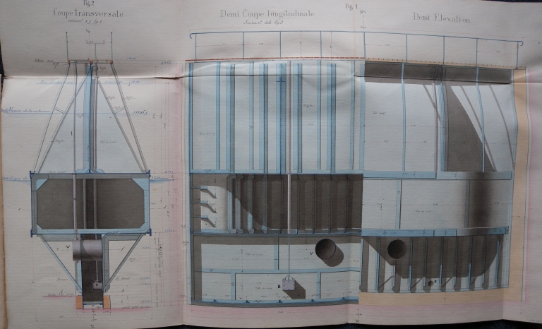 Plan : coupe transversale et longitudinale du bateau-porte, en projet, 1886 (AD 22)Immatriculation