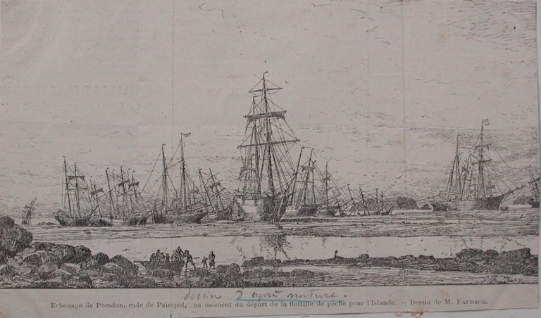 Dessin de Louis-Marie Faudacq : le départ pour la Grande Pêche en rade de Paimpol, Pors Don, 1888 (collection particulière, extrait du Yacht, 18 août 1888, vol. 9)Immatriculation
