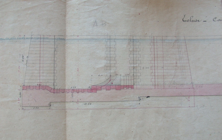 Dessin : coupe transversale d'un vantail de la 1ère écluse, 1875 (AD 22)Immatriculation