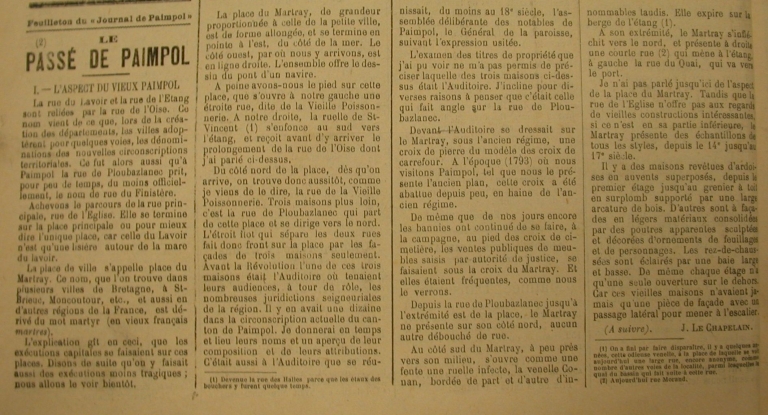 Extrait du 'Journal de Paimpol', 1er trimestre 1897 : 'Le passé de Paimpol' par Jules Le Chapelain, descriptif de la place du Martray ('Archives, 'La Presse d'Armor', collection particulière)Immatriculation