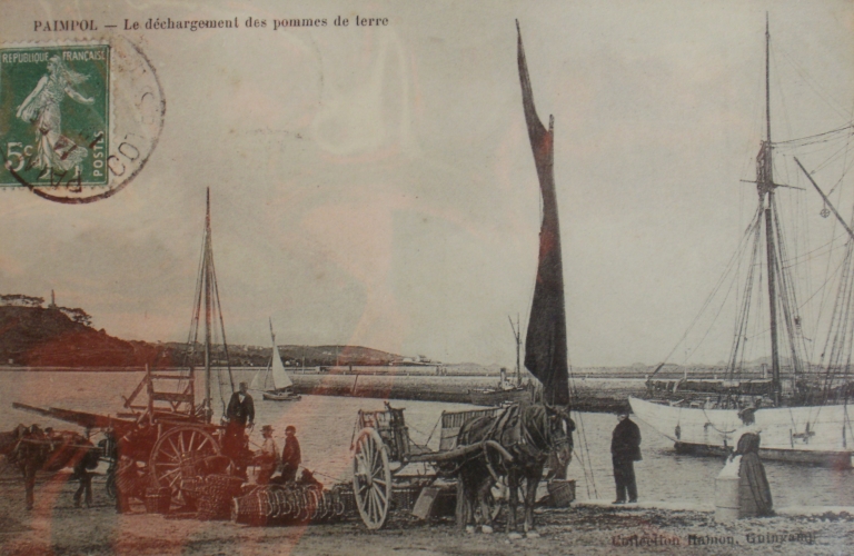 Le déchargement des pommes de terre avec des paniers, en provenance de Bréhat, 1er quart 20ème siècle (carte postale, collection particulière)Immatriculation