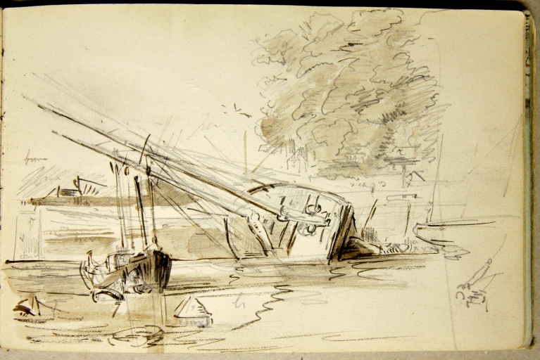 Dessin de Louis-Marie Faudacq : abattage d'un navire en carène, près du quai de Kernoa, 4ème quart 19ème siècle (extrait des carnets de Faudacq, collection particulière)Immatriculation