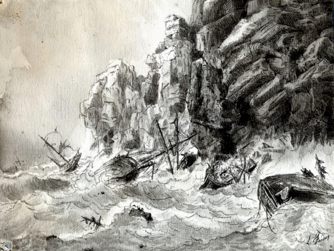Dessin de Louis-Marie Faudacq, non daté : scène de naufrage en Islande (collection particulière)Immatriculation