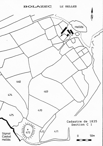 Plan de situation de la motte castrale du Helles (tiré de l'ouvrage de Patrick Kernevez, Les fortifications médiévales du Finistère)Immatriculation