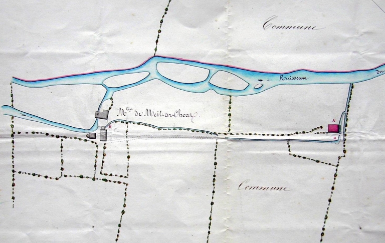 Plan masse de 1865. A gauche, moulin disparu, à droite (en rouge) moulin existant (A.D. Finistère 7 S 82)Immatriculation