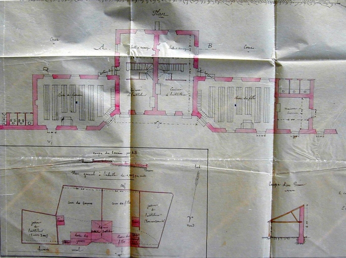 Projet d'établissement scolaires pour filles et garçons en 1883, plan au sol et plan masse (A. D. Finistère, 2 O 887)Immatriculation