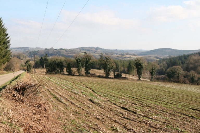 Bocage et vue lointaine sur la forêt domaniale de Saint-Ambroise (bois du Hélas), au nord-est de Ty-ar-Gall, vue vers le nord-estImmatriculation