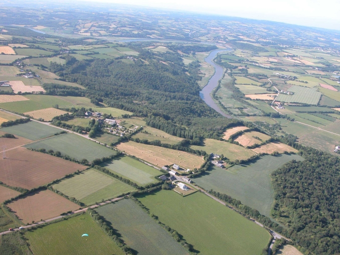 La vallée de l'Aulne, le bois de Trévoazec, les hameaux de Pennalé, Ty Provost et Kergabel. Vue aérienne vers le nord (photo Paraflash)Immatriculation