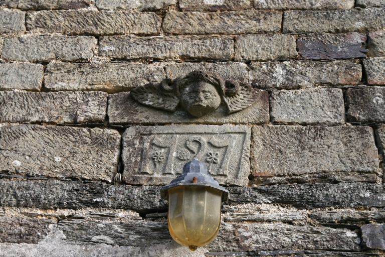 Détail des pierres sculptées : date et tête d'angeImmatriculation