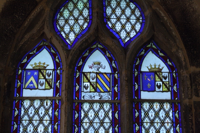 Intérieur, bras sud, détail du vitrail de la baie : armoiries de la famille de Quillien et des familles alliéesImmatriculation