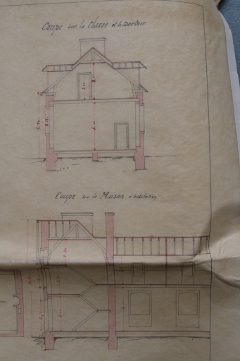Projet d'école de filles, 1879 : coupes de la classe, du dortoir et de la maison d'habitation (A. D. Finistère, 2 O 1119)Immatriculation