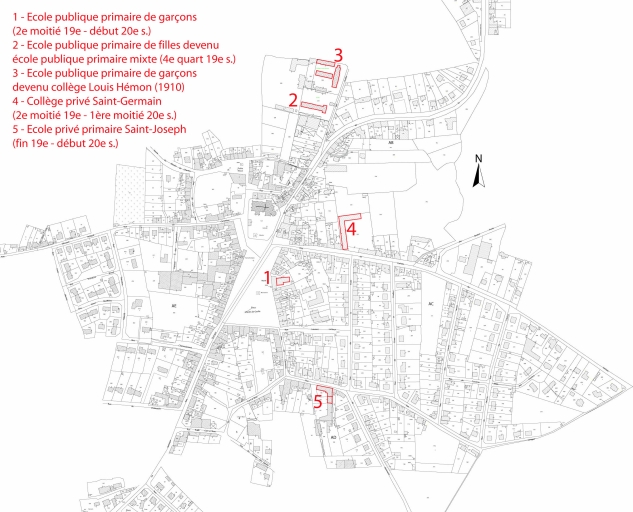 Plan de localisation des écoles et collèges du bourg sur le cadastre actuel (assemblage des sections AB, AC, AD et AE)Immatriculation