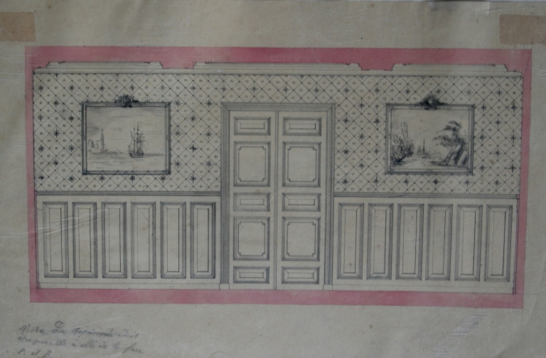Salle de billard, mur est (1851). Dessin Joseph Bigot, architecte (collection particulière)Immatriculation