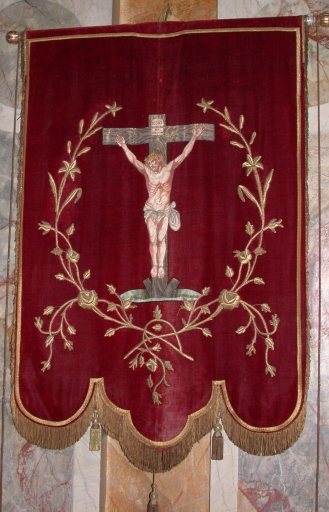 Bannière de procession paroissiale : saint Jean-Baptiste, Christ en croix,