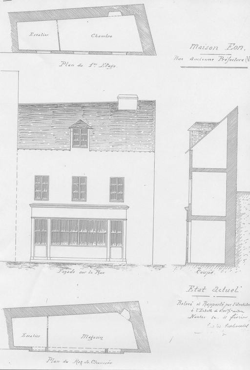 Maison Eon : état actuel, relevé par l'architecte Fraboulet, Nantes, 4 février 1896. AM Vannes 1D2.Immatriculation