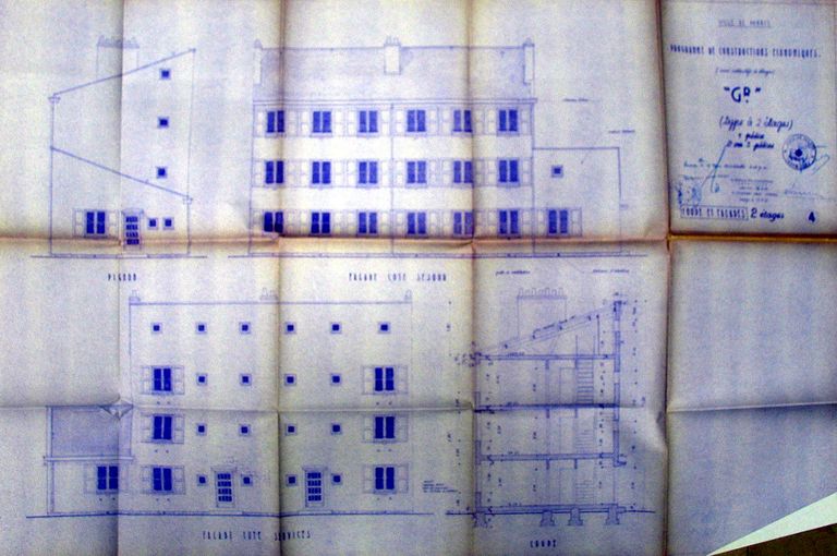 Programmes de constructions économiques, type à 2 étages : coupes et façades par Romualdo-Hautefage, 1951. AM Vannes 5M204.Immatriculation