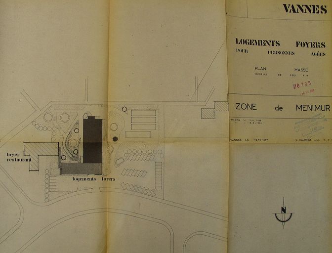 Logements foyers pour personnes agées : plan de masse par Guy Caubert de Cléry, 1968. AM Vannes 35W.Immatriculation