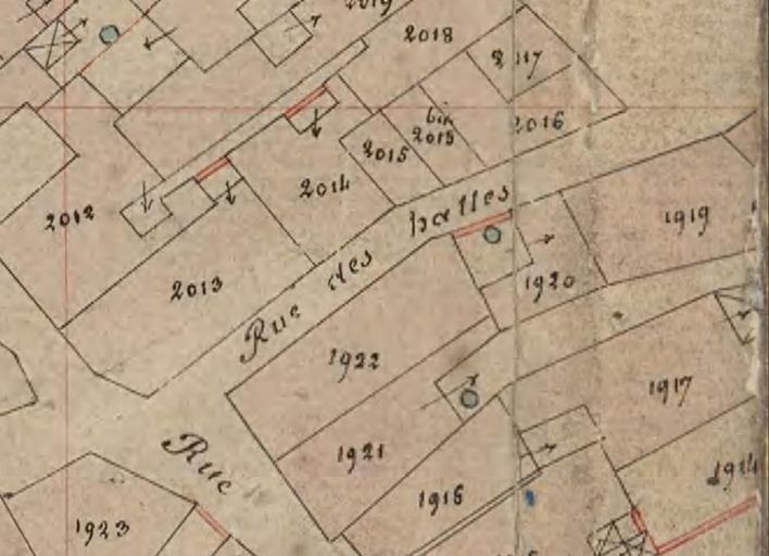 Plan cadastral de 1844 : section K8, détail, rue des Halles (2e tronçon). AD Morbihan 3P 297/53.Immatriculation