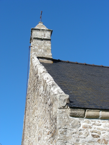 Clocher et pierre d'assise du rampant ouest sculptée d'une tête humaine.Immatriculation