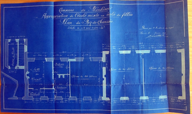 Agrandissement de la mairie-école en école de filles. Plan du rez-de-chaussée par Louis Dutartre, février 1909 (AD Morbihan, 2O169/1420)Immatriculation