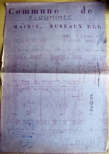 Construction d'une mairie-école. Plan au sol de la mairie bureau de PTT, par Jules Bardet, 1938 (AD Morbihan, 2O 269/1428)Immatriculation
