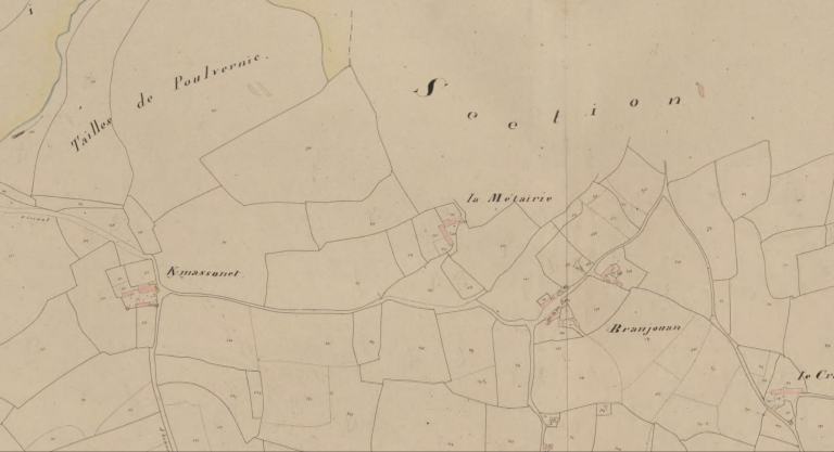 Plan cadastral 1837, section D2 : Kermassonnet et la métairie (AD Morbihan 3P121)Immatriculation