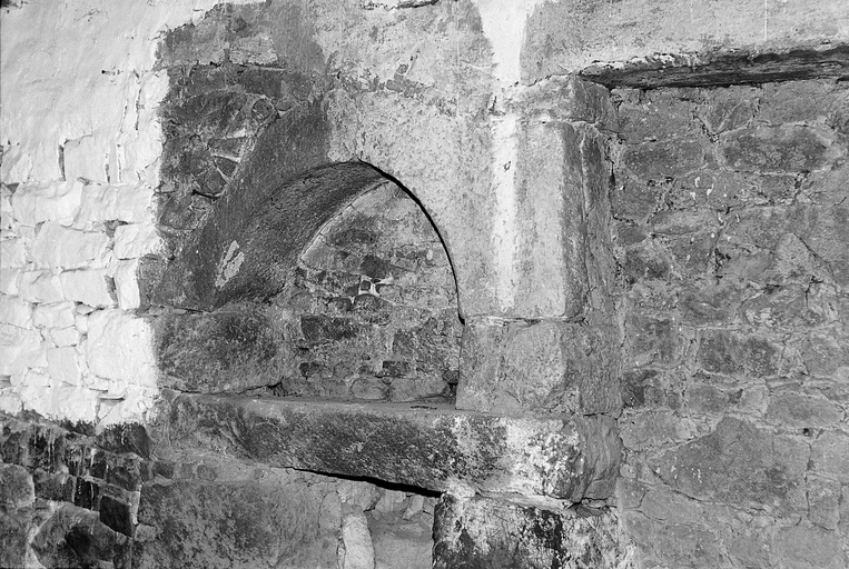 Vue intérieure : vaisselier mural surmontant un évier ou saloir (surnommé "coffre de pierre"), photographie de 1972Immatriculation