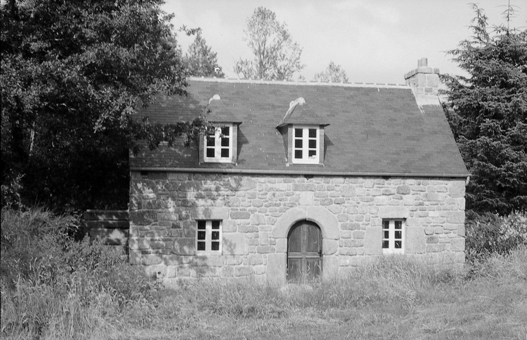 Trégrom, Pont Coz : maison du milieu, façade principale sud, photographie de 1972. L'édifice se caractérise par la présence d'un escalier extérieur et d'une cheminée à l'étage. Maison vraissemblablement construite en 1971 !Immatriculation