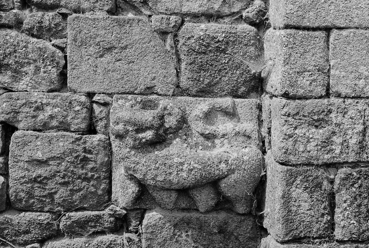 Détail de l'appentis du logis de ferme, élément de décor sculpté représentant un lion et provenant d'un édifice ancien (idem à Keranoc'h)Immatriculation