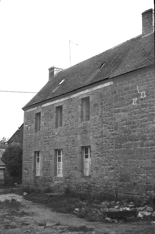 Ferme composée d'un alignement de deux logis, logis sud reconstruit au milieu du 19e siècle, élévation antérieure orientée vers le nord-est, photographie de 1972Immatriculation
