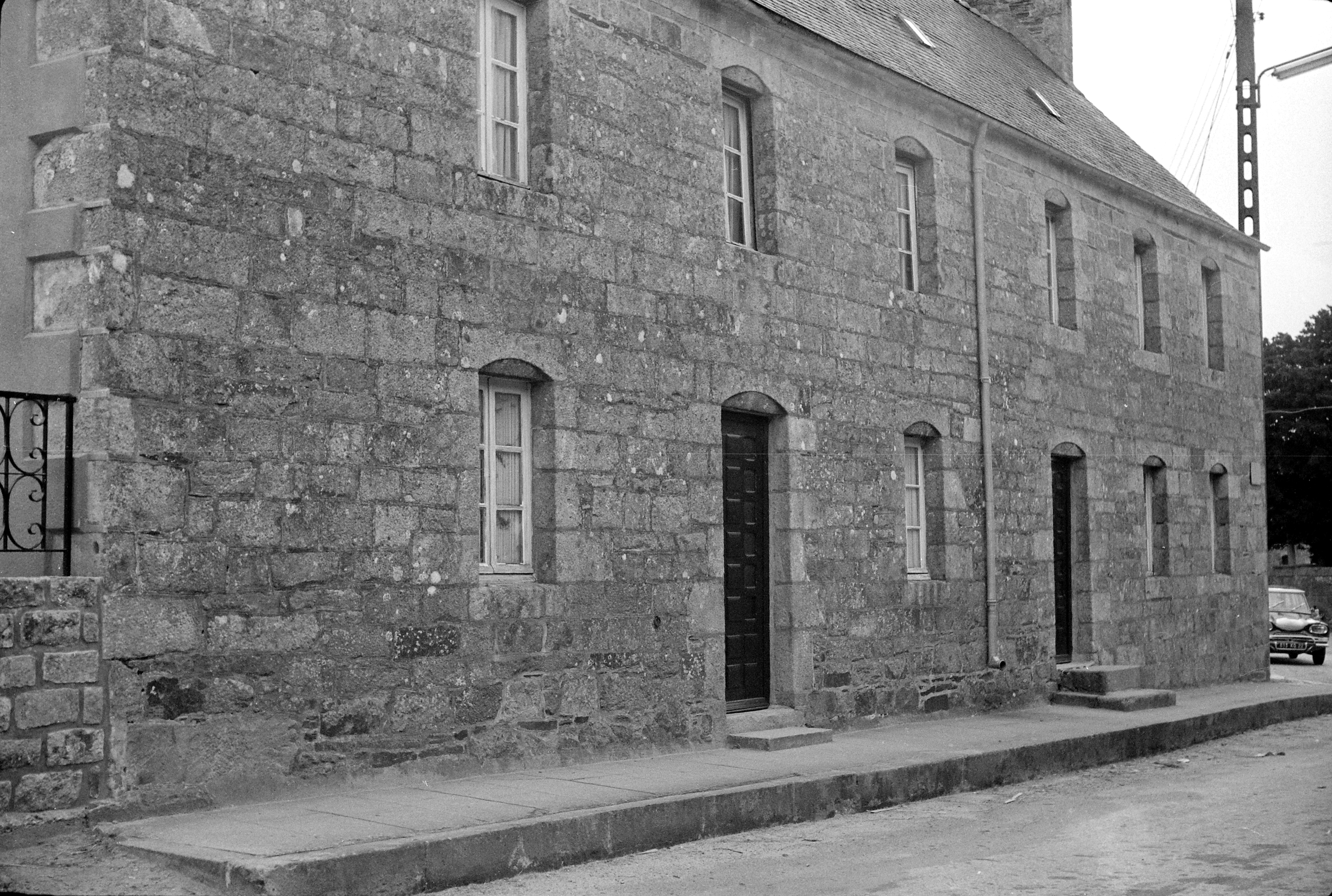 Ploubezre, le bourg, extrémité orientale de la rue Yves Le Cudénnec faisant face à l'église : maison de bourg, élévation antérieure côté rue. Elle est datable du 1er quart du 19e siècle (inscriptions non lisibles), photographie de 1969Immatriculation