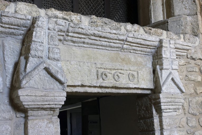 Intérieur, mur nord du choeur, détail, porte de la sacristie datée 1660Immatriculation