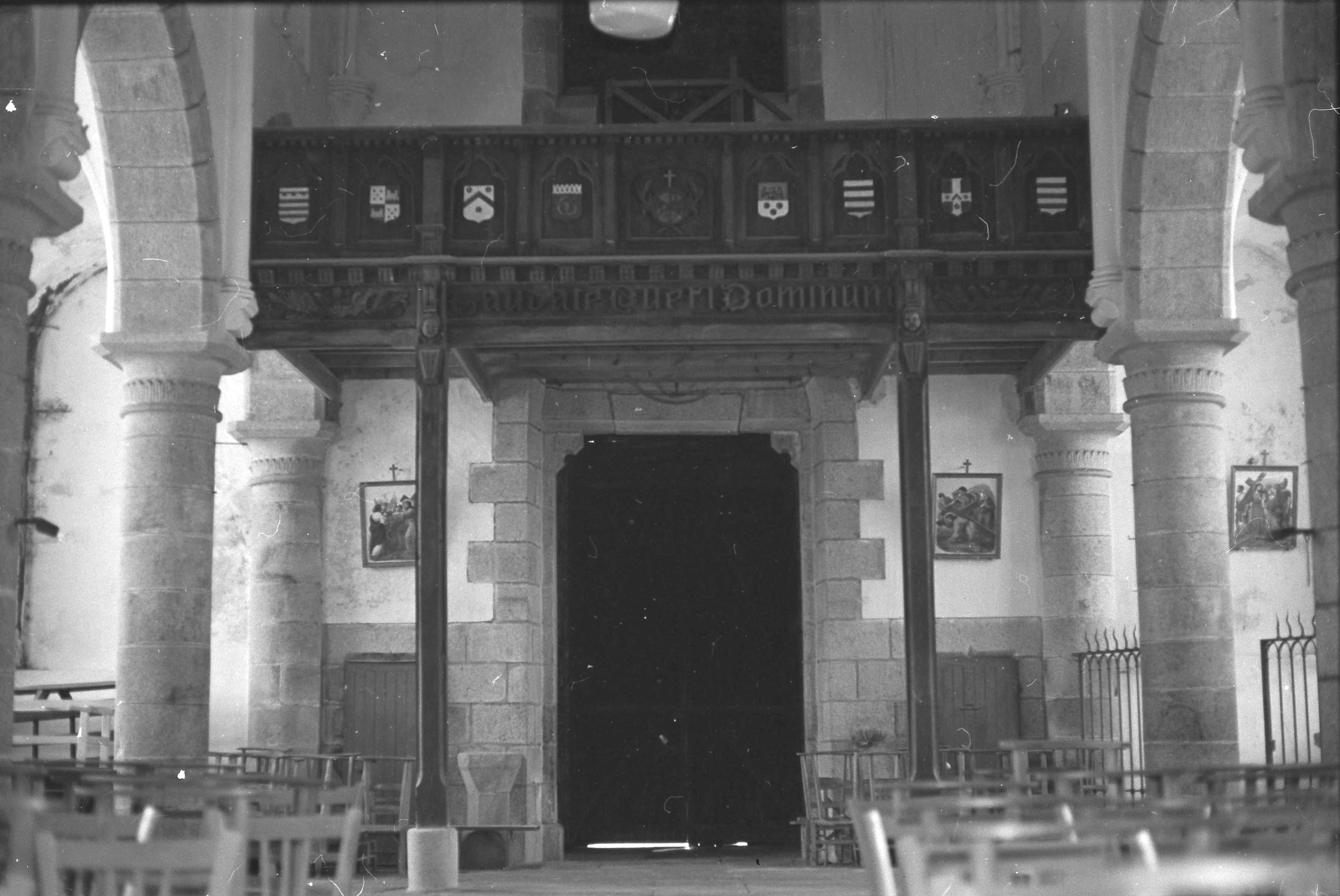 Kermaria-Sulard, le bourg : église paroissiale Notre-Dame-de-la-Joie, tribune, ancienne photographie (1969-1975). On peut lire l'insciption latine : "Laudate pueri Dominum"Immatriculation