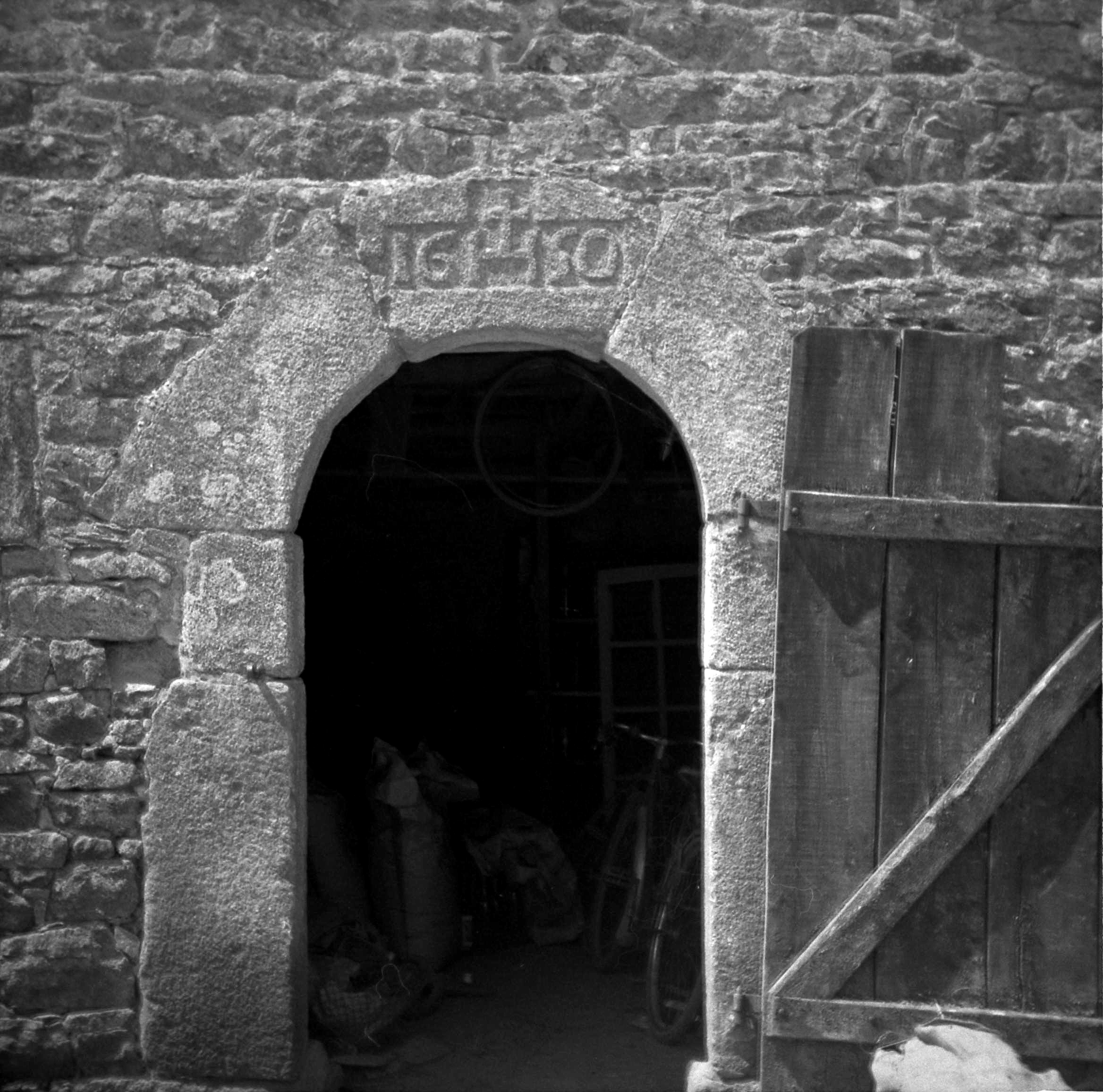 Kermaria-Sulard, Prat Louët : dépendance (écurie et remise), élévation est, détail de la porte en arc plein cintre portant le monogramme du Christ et le millésime 1650, ancienne photographie (1969-1975)Immatriculation