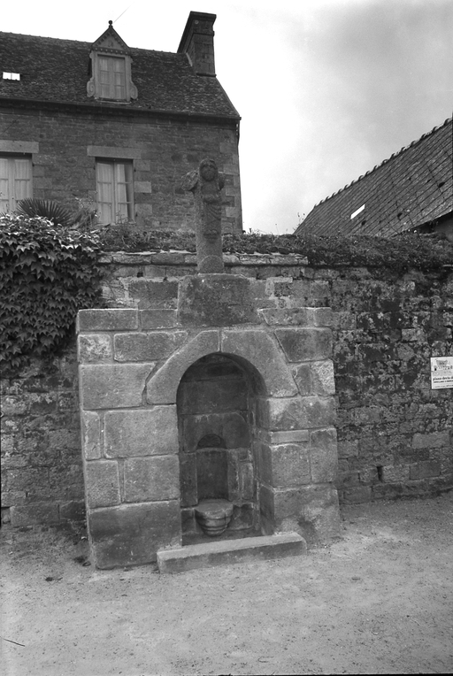 Lanvellec, le bourg, place de l'église : fontaine réalisée par Alain Luca, prêtre en 1620 (initiale A et L de part et d'autre d'un calice sculpté), photographie de 1974. L'édicule, provenant de la chapelle Saint-Loup, a été reconstruit en 1974Immatriculation