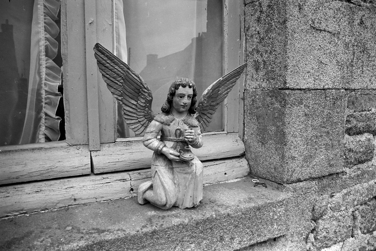 Lanvellec, le bourg, 1 place de l'église : presbytère puis maison, statue, photographie de 1974Immatriculation