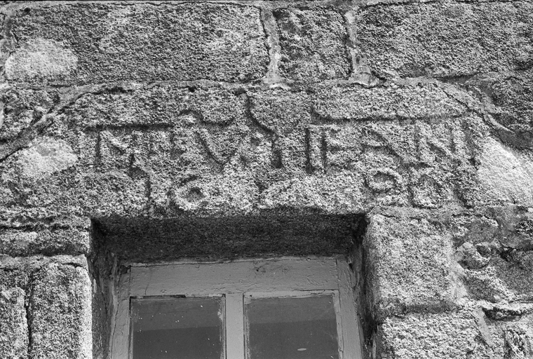 Loguivy-Plougras, Saint-Divy : ancien presbytère dit maison Lejeune, photographie de 1969. Détail de l'inscription du linteauImmatriculation