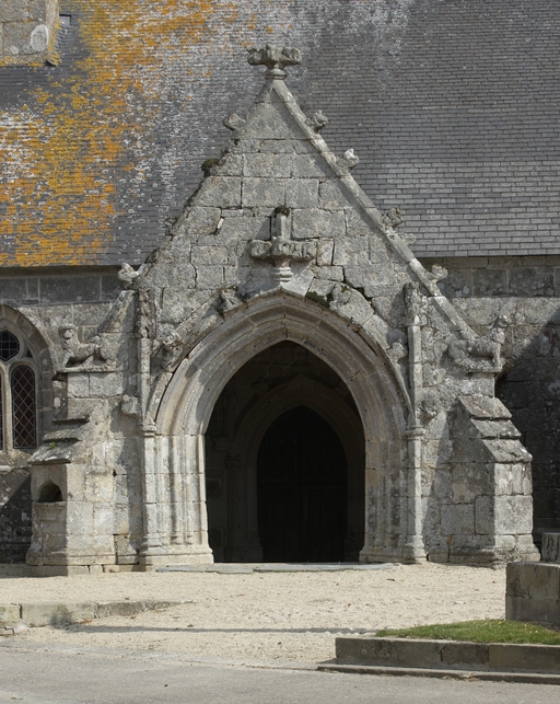 Plougras, le bourg : église paroissiale Saint-Pierre, vue du porche sudImmatriculation