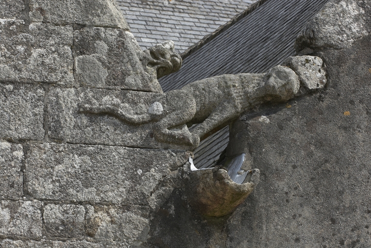 Plougras, le bourg : église paroissiale Saint-Pierre, vue de détail du décor du transept sudImmatriculation