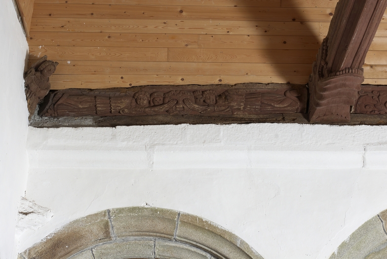 Plougras, le bourg : vue intérieure de l'église paroissiale Saint-Pierre, chapelle sud, sablière sculptéeImmatriculation