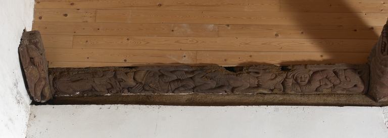 Plougras, le bourg : vue intérieure de l'église paroissiale Saint-Pierre, chapelle sud, sablière sculptéeImmatriculation